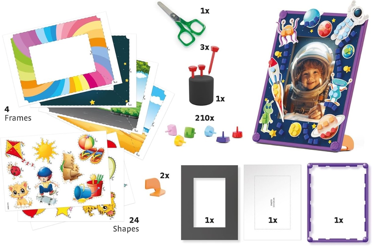 Комплектация1 рамка, 2 ножки, 1 картонная подставка для фотографий, 1 рамка из губки, 1 ножницы, 210 булавок 7 цветов, круглых и квадратных, 1 листовка с рамками и иллюстрациями для вырезания
