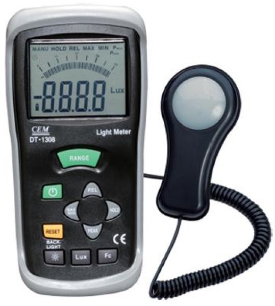 Имеритель освещенности DT-1308 спроектирован для измерения освещенности в ед. люкс или фут-кандела. Спектральная чувствительность прибора соответствует относительной спектральной световой эффективности C. I. E. Измеритель освещенности (люксметр) CEM DT-1308 полностью скорректирован по косинусу от ошибки при измерении освещённости, создаваемой светом, падающим под углом. В качестве светочувствительного датчика в этом приборе используется высокостабильный, с продолжительным сроком службы кремниевый фотодиод со специальным корригирующим фильтром.