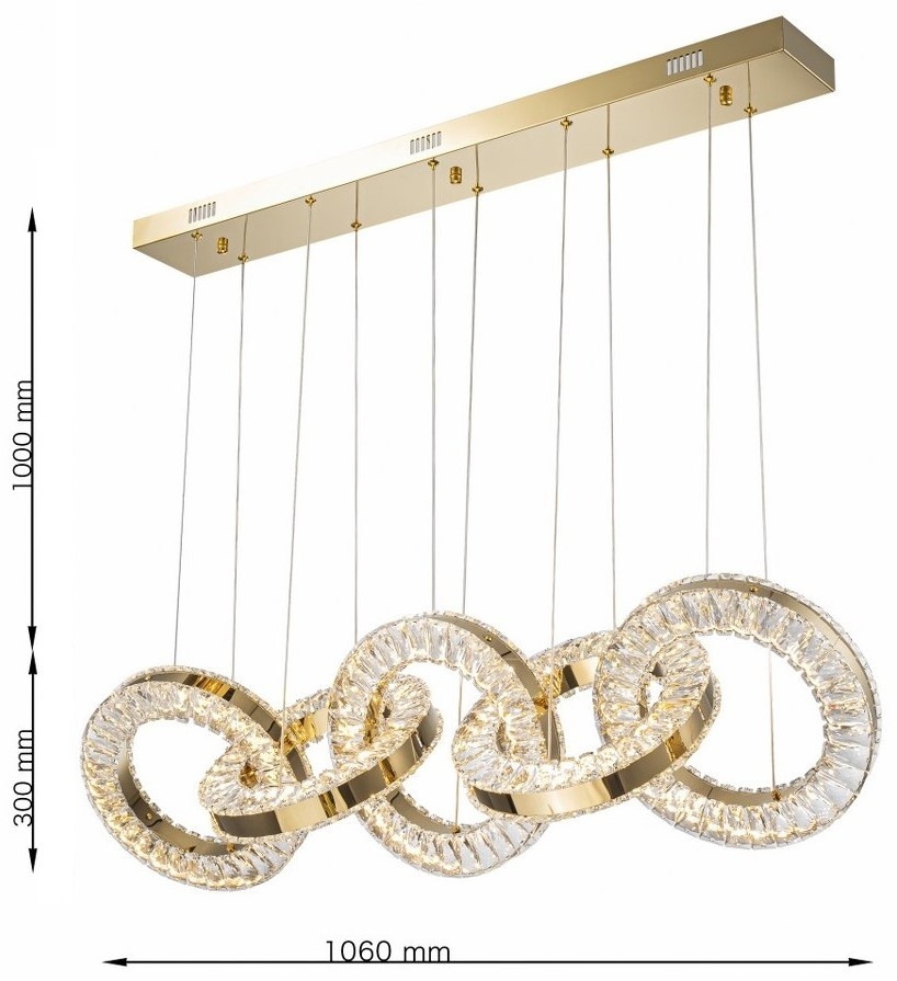 Светодиодный подвесной светильник с пятью переплетающимися кольцами - это впечатляющий дизайн, сочетающий в себе изысканность и современность. Его золотистая структура подчеркивает блеск граненых кристаллов, которые элегантно отражают свет, создавая динамичный и захватывающий визуальный эффект. Благодаря сбалансированной подвеске и инновационному дизайну он идеально подходит для освещения больших помещений, таких как столовые, гостиные или зоны приема. Его высокоэффективная светодиодная система обеспечивает длительное и теплое освещение, что делает его идеальным выбором для тех, кто ищет роскошь и функциональность в одном декоративном элементе.