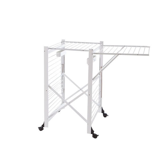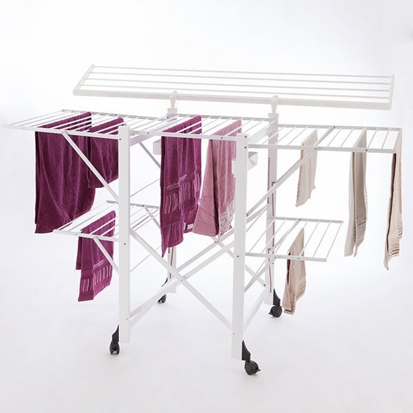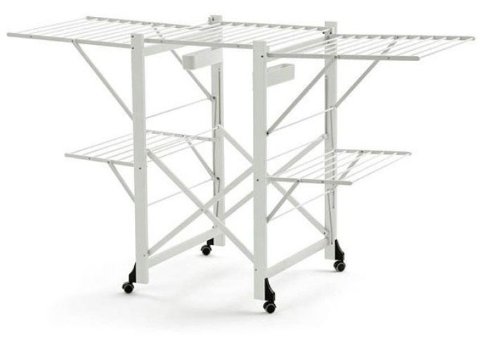 Длина верёвки 30 метров позволяет развесить большое количество вещей, а в сложенном виде сушилка занимает всего 17 см и может храниться в любом уголке дома. Оснащена фиксируемыми колёсами из не оставляющей следов резины, благодаря чему её можно легко перемещать, не повреждая пол. Изделие также имеет удобную корзинку для прищепок.