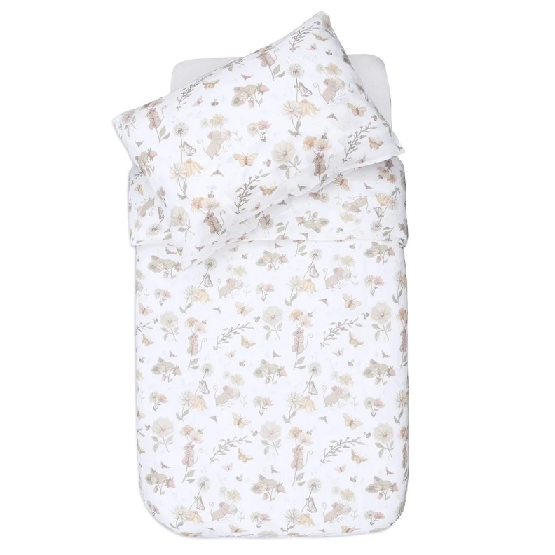 Постельное белье с рисунком «Dreamy Mouse» выглядит очень мило: на нем изображена мышка, нюхающая цветок, а рядом с ней летает крошечная пчелка.