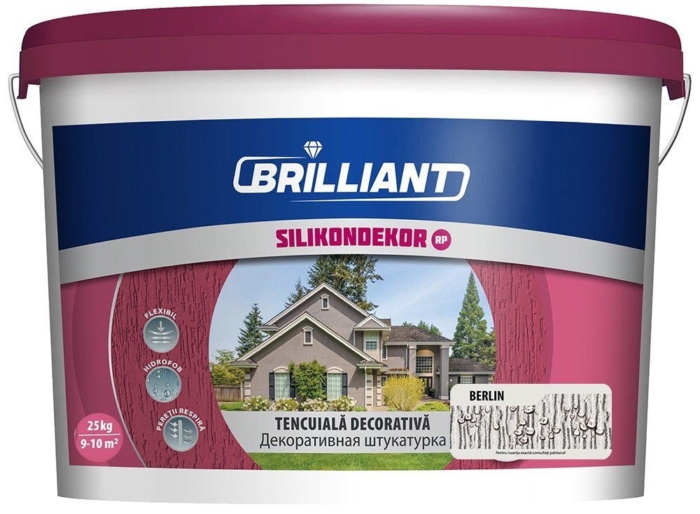 Декоративная штукатурка Brilliant Silikondekor RP - декоративная штукатурка, твердая, матовая, структурированная, используется при внутренних и наружных отделочных работах; декоративная штукатурка на основе синтетической смолы, с добавлением силиконизированного латекса и минеральных наполнителей, размер гранул 1,2–1,8 мм; вид массы - однородная паста; наносится на любое минеральное основание: обычные известкого-цементные штукатурки, гипсовые шпатлевки, бетон, гипсокартонные листы и старые окрашенные поверхности стойкие к трению и истиранию.