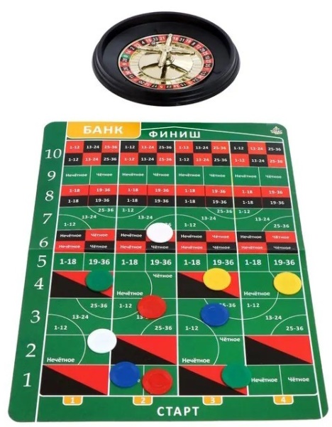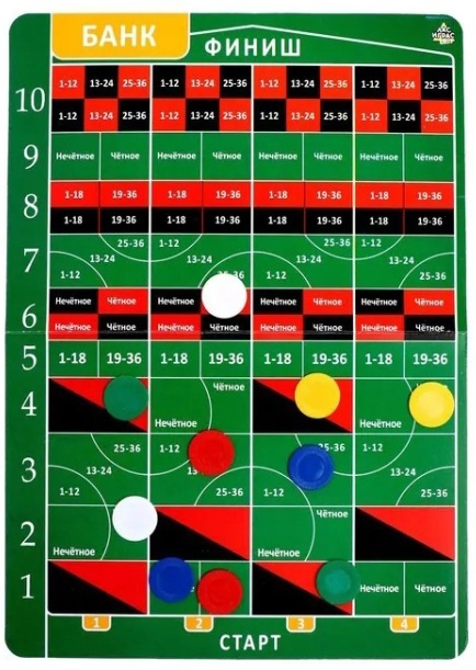 Комплектацияфишки для игроков, рулетка, 2 шарика, набор жетонов, игровое поле, правила игры