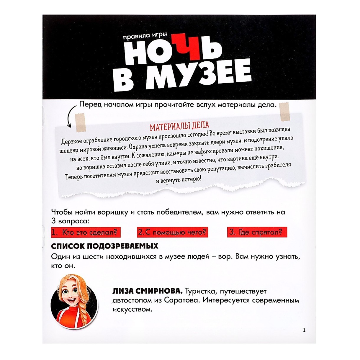«Ночь в музее» — настольная игра для детей от 8 лет. Ребёнок окажется в центре детективных событий. Сюжет привлечет внимание юного сыщика и погрузит в мир тайн и загадок.
