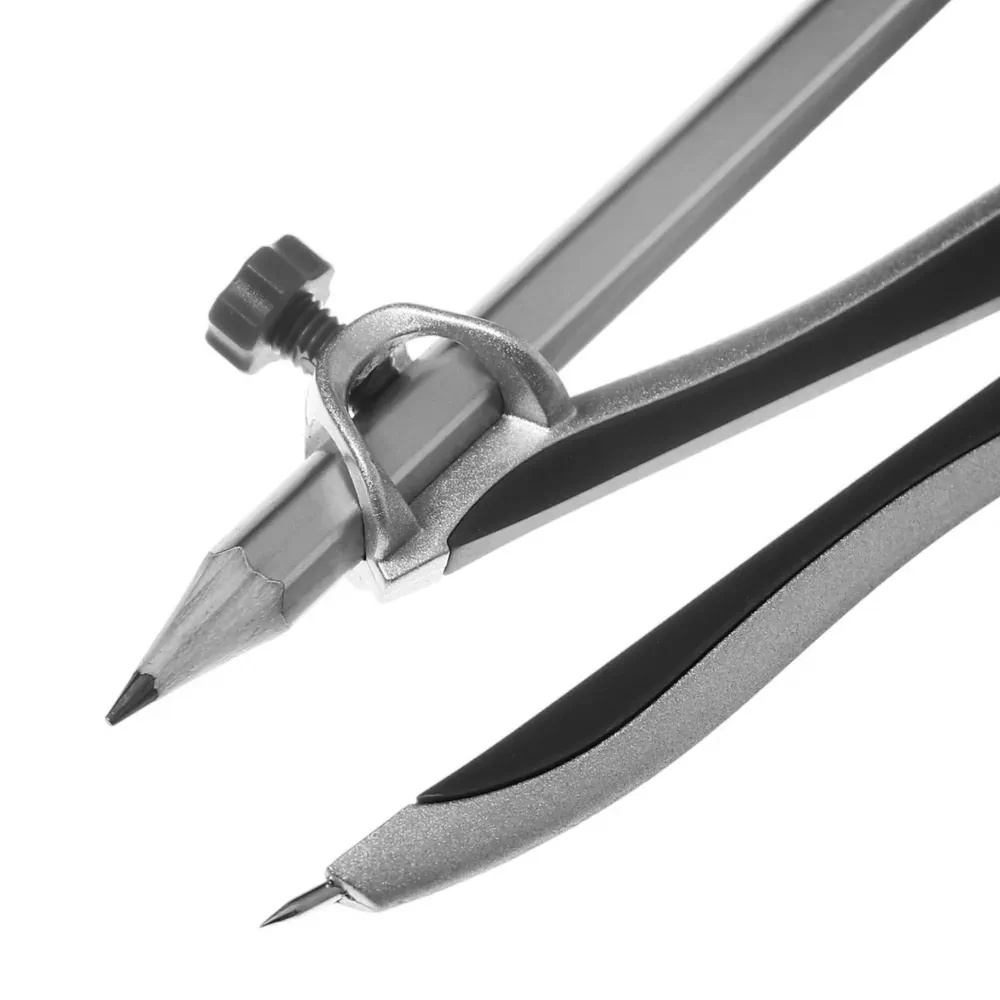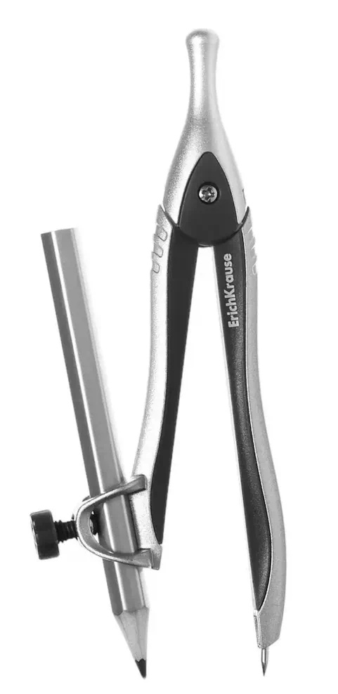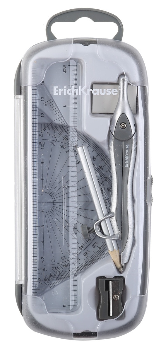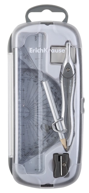 Металлический циркуль с максимальным радиусом 150 мм. В комплект входят линейка, два угольника, транспортир, ластик, точилка.