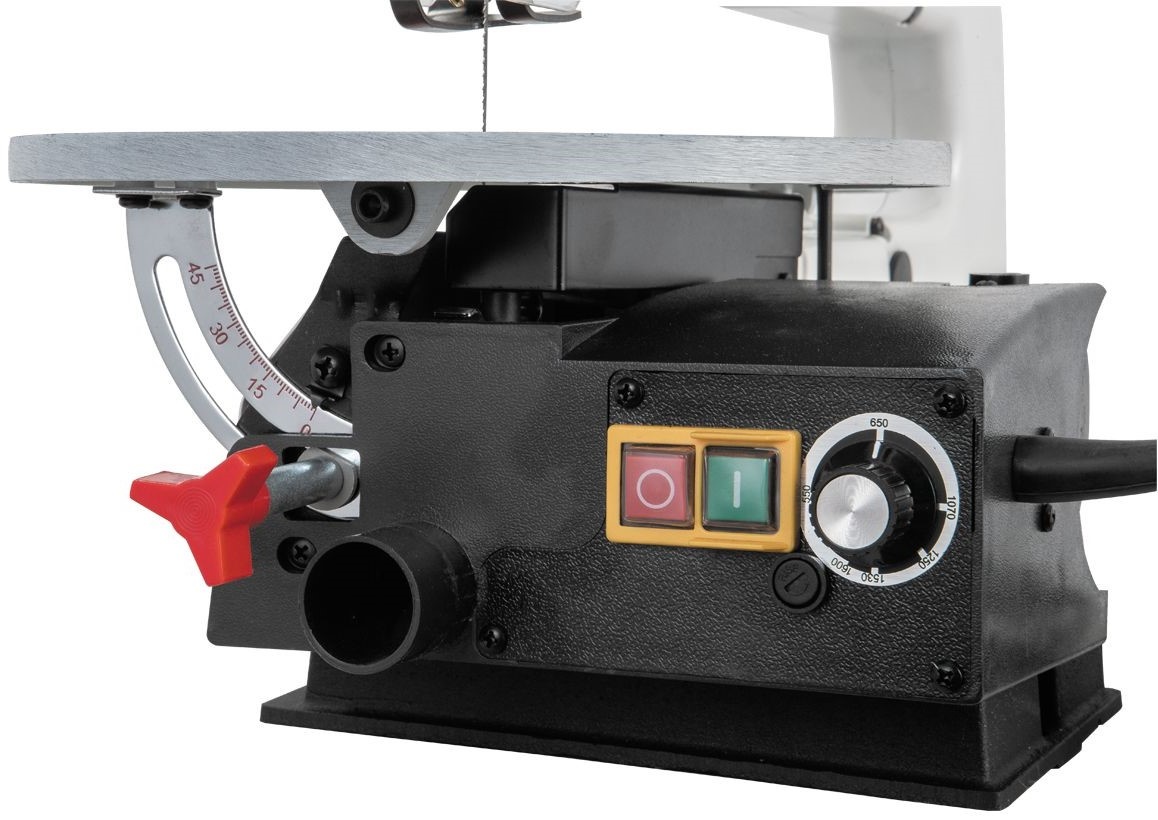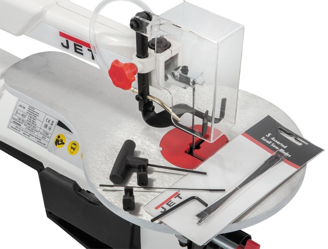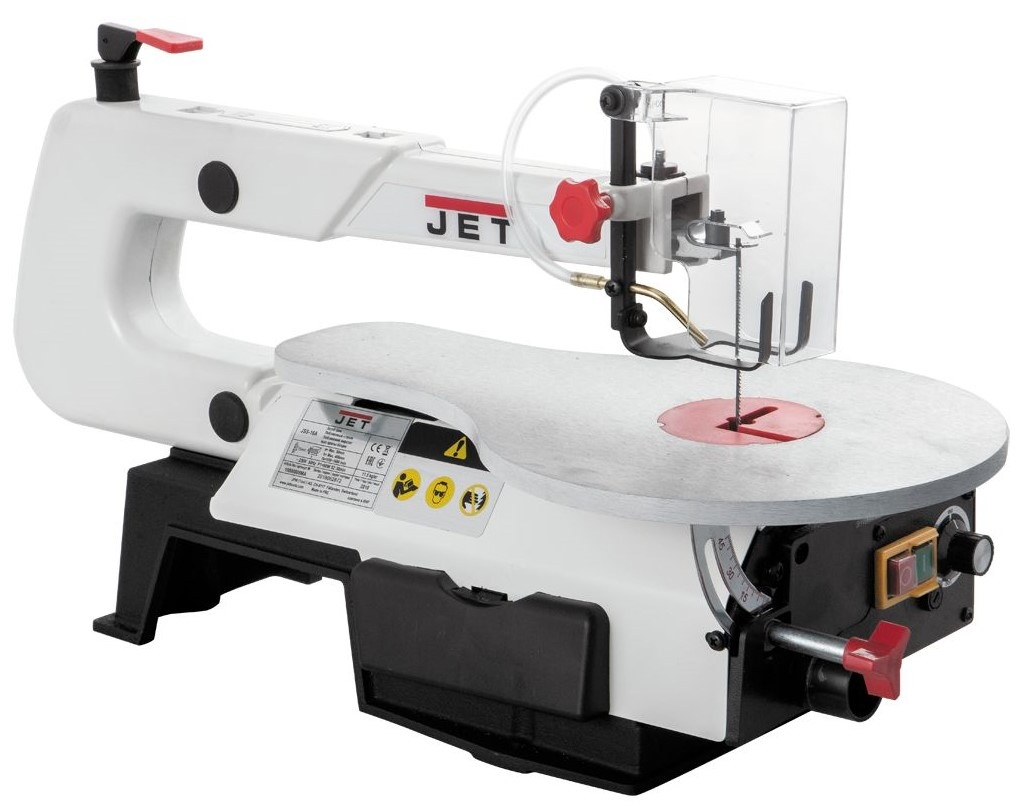 Jet JSS-16A — любительский лобзиковый станок для выпиливания сложных радиусов в не слишком крупных заготовках из древесины, ДСП, ДВП, фанеры или пластмассы. Модель представляет собой улучшенную модификацию хорошо известного лобзикового станка Jet JSS-16 и имеет ряд интересных конструктивных особенностей, выгодно отличающих ее от аналогов других марок. Прежде всего, это универсальность в отношении используемых полотен: можно устанавливать пилки как со штифтовым креплением, так и без него. Важно отметить удобное верхнее расположение рычага натяжения полотна. Новое усовершенствование в конструкции — возможность изменить ориентацию плоскости распила: вдоль или поперек продольной оси станка, смотря как удобнее или привычнее оператору.