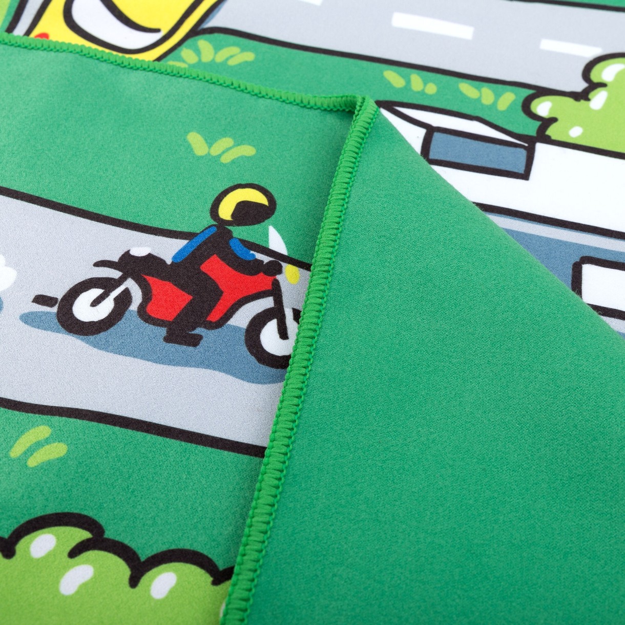 Несмотря на большой размер, полотенце занимает мало места. На 80% меньше места, чем в стандартной версии. Благодаря своим свойствам полотенце высыхает намного быстрее стандартного. Его преимуществом является и интересный рисунок, который обязательно понравится детям — они с удовольствием вылезут из воды, когда вы их позовете.