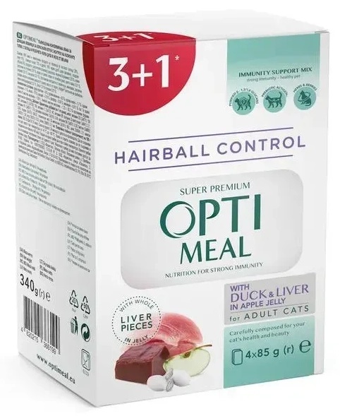 Характеристики Влажный корм для кошек Optimeal Adult Cat Hairball Control Duck & Liver 85g