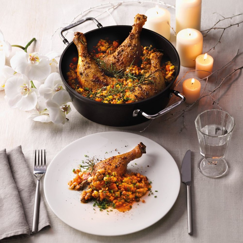 Корпус жаровни сделан из литого алюминия с антипригарным покрытием. Ручки из нержавеющей стали не нагреваются в процессе готовки за счет специальных силиконовых вставок. Высококачественное антипригарное покрытие «Protectal +» предотвращает прилипание продуктов ко дну и стенкам кастрюли. Посуда из серии «Luno» подходит как для индукционных плит, так и для других типов. Пустую жаровню не подвергать воздействию высоких температур. После приготовления пищи, остудите, залейте водой для избежания прилипания пищи, вымойте и вытрите насухо. Мыть жидким моющим средством, без применения абразивных веществ и металлических губок. Не рекомендуется мыть в посудомоечной машине из-за возможного появления белого налета на поверхности.