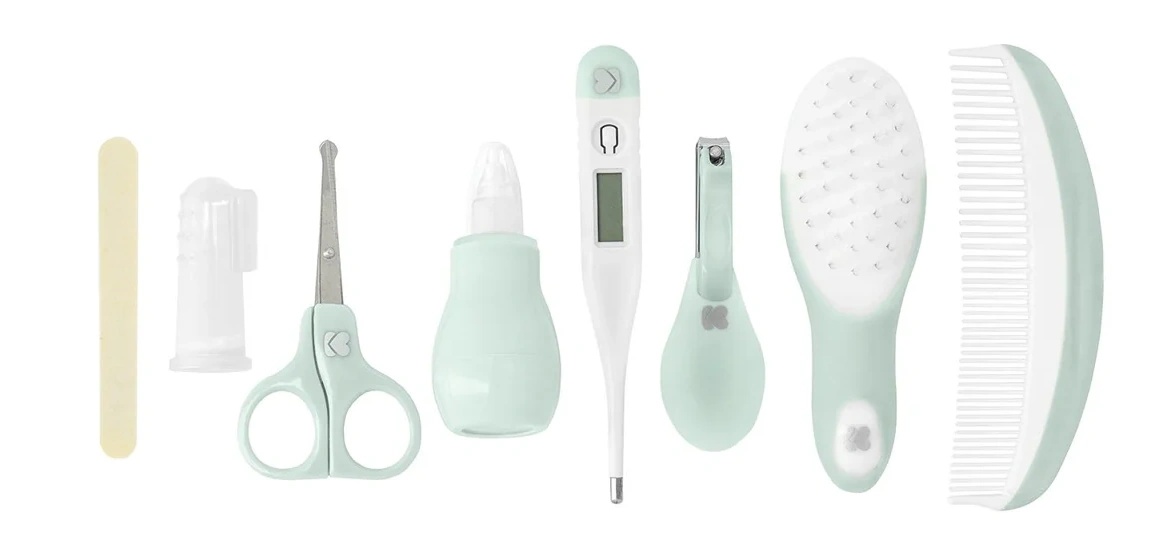 В комплект входят: цифровой термометр, назальный аспиратор, расческа, щетка для волос, массажер для десен, кусачки для ногтей, ножницы и пилочки для ногтей.