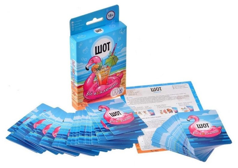 Шот – это веселая игра для вечеринки для любителей выпить на тему отпуска на море. Правила очень простые: либо выполняете задания с карточки, либо пьёте, если задание не понравилось. Игра заканчивается, когда из колоды будет вытянута карта "Пора домой".
