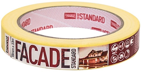 Клейкая лента Facade Standard предназначена для наружного использования. Тип клея: растворитель (натуральный каучук), общая толщина ленты 145 мкм. Лента предназначена для защиты поверхности при изготовлении фасадов, а также для различных других работ, выполняемых на открытом воздухе. Рекомендуется использовать на различных типах поверхностей (стена, гипсокартон, дерево, ПВХ, металл). Стандартный уровень прочности склеивания. Рекомендуемое время снятия с поверхности — 48 часов. Не оставляет следов клея. Устойчивость к температуре до 80 ᵒC. Цвет: желтый. Ширина 18 мм.