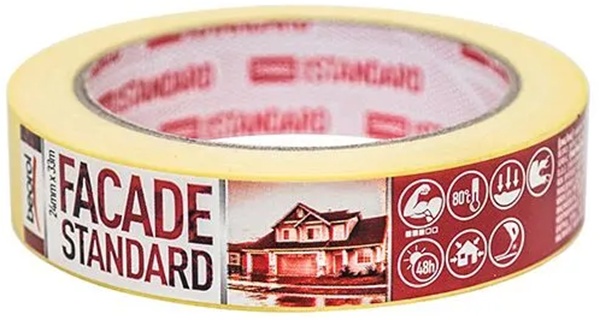 Клейкая лента Facade Standard предназначена для наружного использования. Тип клея: растворитель (натуральный каучук), общая толщина ленты 145 мкм. Лента предназначена для защиты поверхности при изготовлении фасадов, а также для различных других работ, выполняемых на открытом воздухе. Рекомендуется использовать на различных типах поверхностей (стена, гипсокартон, дерево, ПВХ, металл). Стандартный уровень прочности склеивания. Рекомендуемое время снятия с поверхности — 48 часов. Не оставляет следов клея. Устойчивость к температуре до 80 ᵒC. Цвет: желтый. Ширина 24 мм.