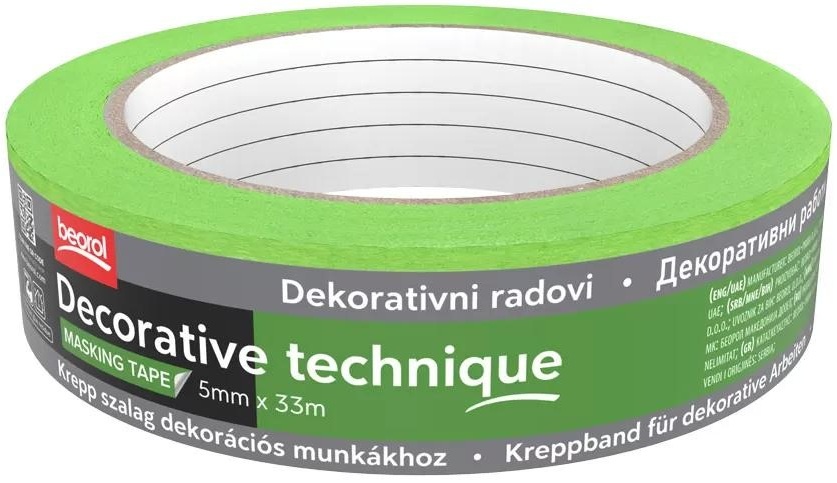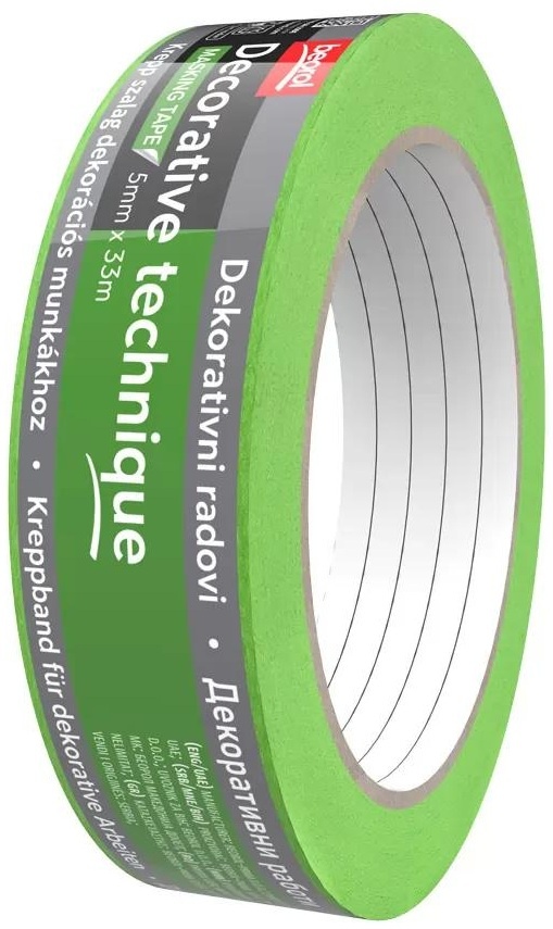 Малярная лента для декоративных работ 5 мм x 33 м используется для создания эффекта травертина, разделения швов при создании краевых эффектов или имитации досок и подобных дизайнов. Лента имеет клей из натурального каучука и эластичную бумагу. Удаление ленты в полусухом состоянии материала позволяет аккуратно удалить ленту и получить четкие линии швов. Предназначена для профессиональных и полупрофессиональных маляров, а также для любителей. Температурная стойкость составляет 60 °C в течение 45 минут. Толщина бумаги — 125 микрон. Цвет: зеленый.