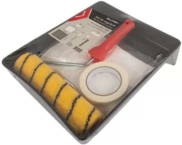 Комплектацияваночка, валик 250мм, кисть 38мм, пленка защитная 4х5м, лента малярная 19ммх45м