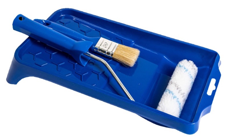 Комплектациясиняя ванночка размером 15х32см, кисть 30х15мм с акриловой щетиной синего цвета, радиаторный валик Blue Line 10см с ручкой