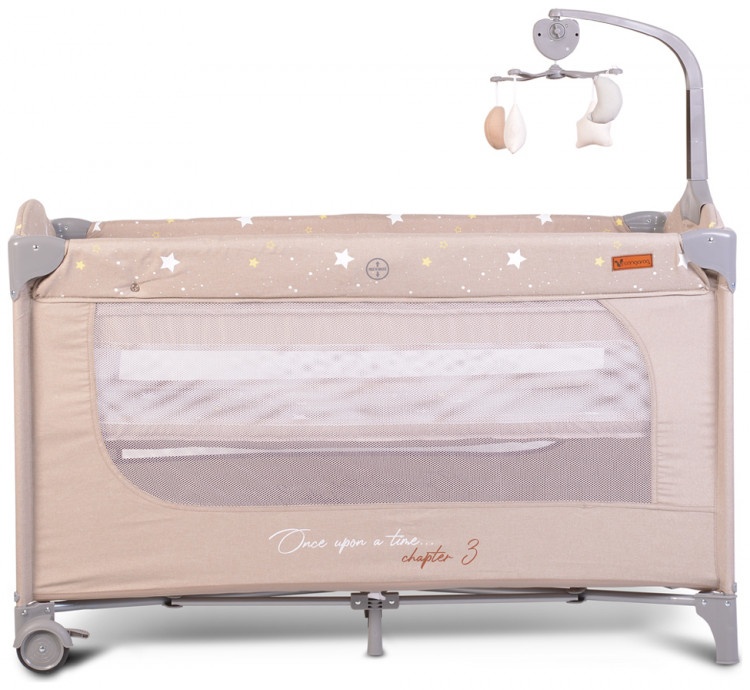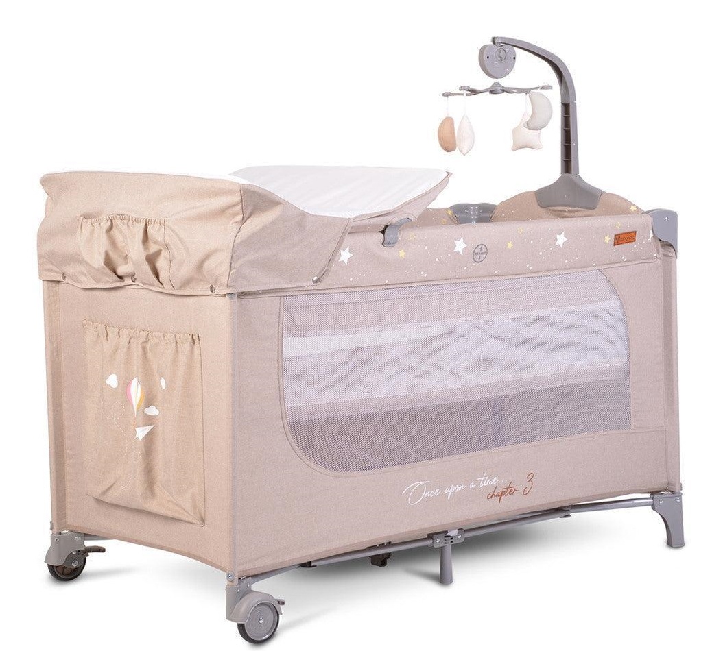 Оптимально закрепленный 2-й слой подходит для сна, предназначен для детей от 0 до 6 месяцев. Включает съемный пеленальный столик; Музыкальный мобиль с 4 игрушками. С большим боковым карманом для игрушек. Высококачественная льняная ткань с принтом в виде сказок. Боковой вход на молнии, позволяющий ребенку входить и выходить из игровой площадки, когда он ползает.