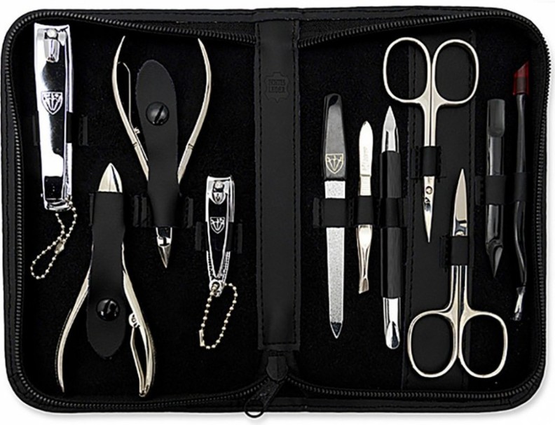 Набор из 11 предметов укомплектован инструментами из высококачественной никелированной стали немецкого производителя Kellermann. Инструменты хранятся в черном футляре из натуральной кожи с гладкой поверхностью и застежкой на молнию.