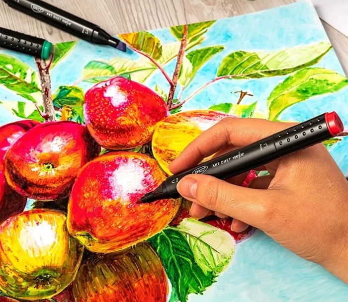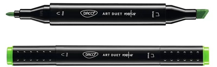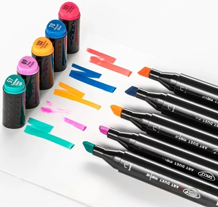 DACO Art Duet — двусторонние маркеры на спиртовой основе. Профессиональные маркеры 2 в 1: каждый маркер в этом наборе имеет два конца. Один из них имеет тонкий наконечник, идеально подходящий для сложных деталей, а другой имеет остроконечный наконечник, который часто используется для создания более толстых линий. Корпус маркера эргономичен, специально разработан для обеспечения легкого и удобного захвата без соскальзывания, а также для предотвращения скатывания маркеров с рабочей поверхности. Широкая цветовая гамма: набор содержит 79 маркеров на спиртовой основе различных цветов, как основных, так и дополнительных цветов, бесцветный маркер, специально разработанный для создания теней, и карманный блокнот для рисования. На колпачки маркеров нанесен цветовой код, который помогает идентифицировать цвета. Они идеально подходят для использования профессионалами в своих проектах дизайна, а также любителями или художниками манги (техника, основанная на японском искусстве) в своих эскизах или рисунках. Легко транспортировать: вы можете брать этот набор маркеров с собой куда угодно благодаря ящику для хранения, в котором можно хранить и упорядочивать до 80 штук. Многофункциональные маркеры: этот набор маркеров идеально подходит для использования на большинстве поверхностей: бумаге, стекле, дереве или пластике. Благодаря быстрому высыханию не оставляет пятен на используемых поверхностях. Чтобы избежать их высыхания, обязательно ставьте колпачки после использования. Простые в использовании, безопасные и нетоксичные: эти маркеры тщательно протестированы и соответствуют стандартам ASTM D-4236 и EN71.