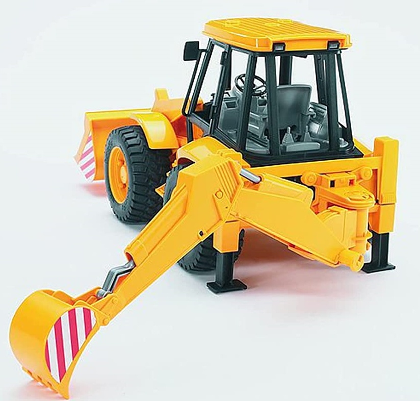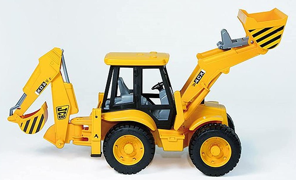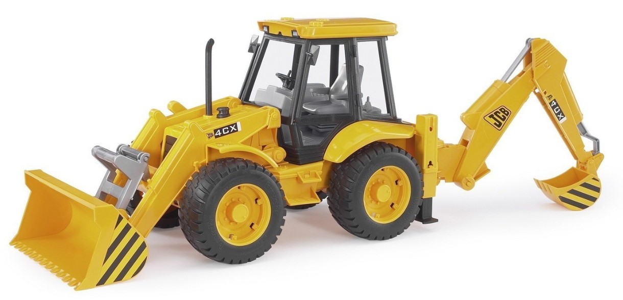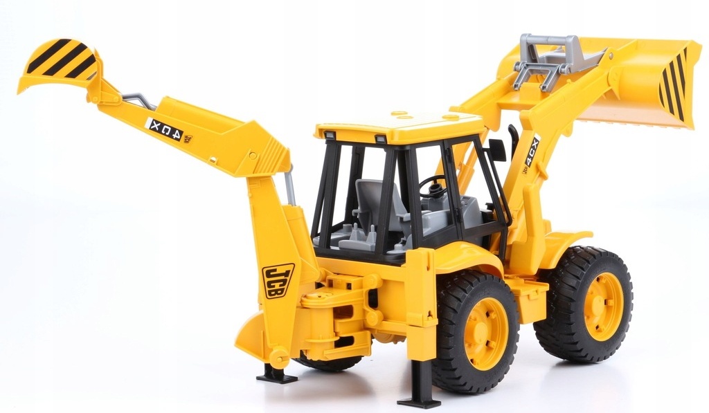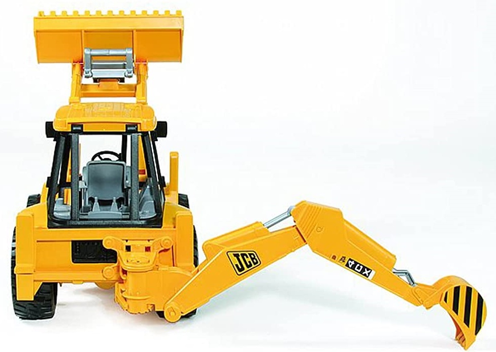 Экскаватор-погрузчик имеет полнофункциональную переднюю лопату, которую можно зафиксировать в самом верхнем положении. Передний ковш можно наклонять, а сиденье водителя поворачивать на 360°. Кроме того, руль подвижен. Обратная лопата также полностью функциональна и может перемещаться по горизонтали, поворачиваться на 180° и фиксироваться. Две выдвижные опоры обеспечивают надежную фиксацию экскаватора-погрузчика, а протекторные шины дополняют картину.
