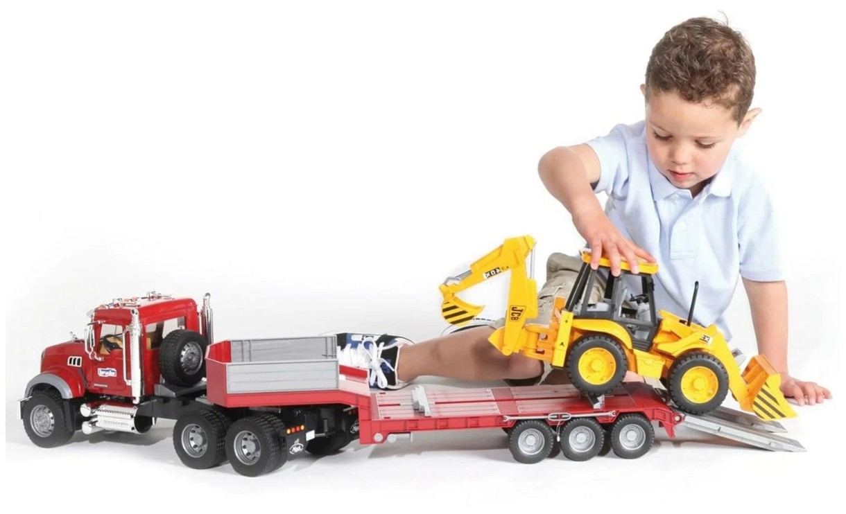 Брудер Тягач с прицепом MACK с экскаватором Bruder 02813 Набор выполнен в масштабе 1:16 сочетается с другой техникой Bruder. У тягача откидывается капот, открываются двери кабины, зеркала могут складываться. При перевозке, прицеп-платформе тягач фиксируется. Для съезда тягача предусмотрен трап.