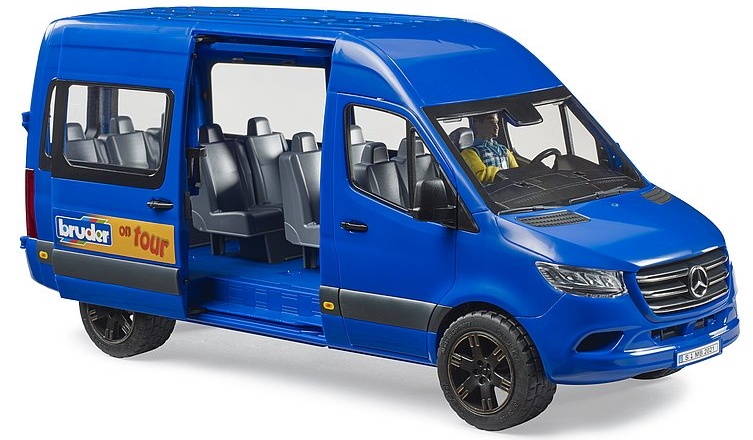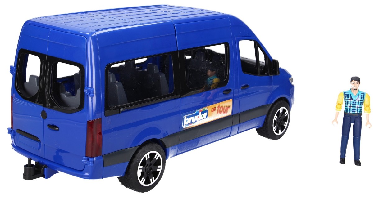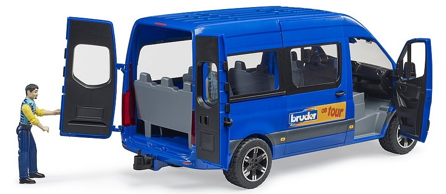 Машинка Bruder микроавтобус Mercedes Sprinter с фигуркой водителя (02681) это настоящий микроавтобус Mercedes Sprinter, только в очень уменьшенном виде (масштаб 1:16). Он великолепно детализирован: прозрачные фары и стекла, зеркала заднего вида, на дисках резиновые покрышки с протектором. Выкрашена машинка в синий цвет, дополнена для реалистичности элементами на кузове как у настоящего Спринтера (значок марки машины, детализированная решетка радиатора, воздухозаборники на капоте, номер машины, ручки дверей, отражатели и т.д). Для еще большей реалистичности у микроавтобуса открываются водительские и задние двери, пассажирские боковые двери раздвижные. Загляни в салон! Он тоже прекрасно детализирован - ряд пассажирских сидений тут словно в настоящем, водительское сиденье, торпеда, руль. Усади фигурку водителя, и поехали! Также в поездку можно взять и другие фигурки bWorld.