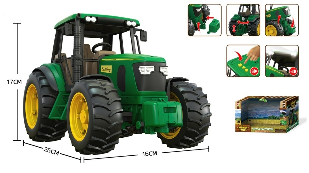 Зеленый трактор с звуками и светом - это захватывающая игрушка, идеально подходящая для маленьких фермеров! Этот трактор оснащен звуковыми эффектами и огнями, что добавляет игре больше реализма. Система трения позволяет легко двигать трактор, не используя батареи.