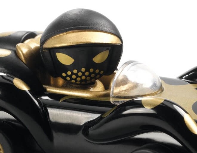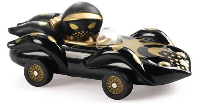 Игрушечная машинка Djeco окрашена в черный глянцевый цвет. Он изготовлен из металла в сочетании с пластиковыми деталями, что придает автомобилю изысканный вид. Персонаж приклеен к металлической игрушечной машинке, поэтому менять его на другие фигурки нельзя.
