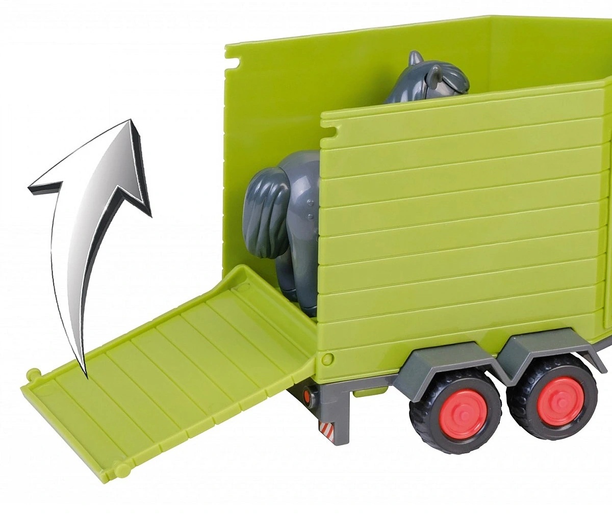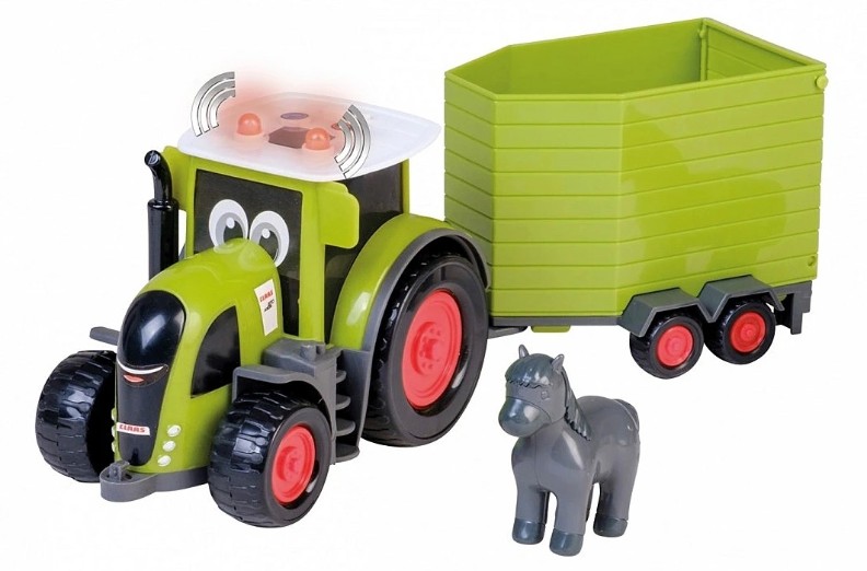 Детский набор Traktor Class Kids включает тягач, прицеп для животных и лошадку. Трактор и прицеп в веселом и красочном оформлении, зеленого цвета с черными колесами с красными вставками. После нажатия соответствующей кнопки в кабине трактор издает звук двигателя и загораются сигнальные лампы.