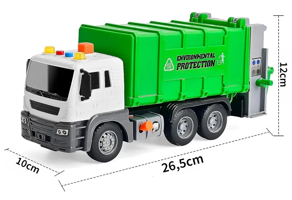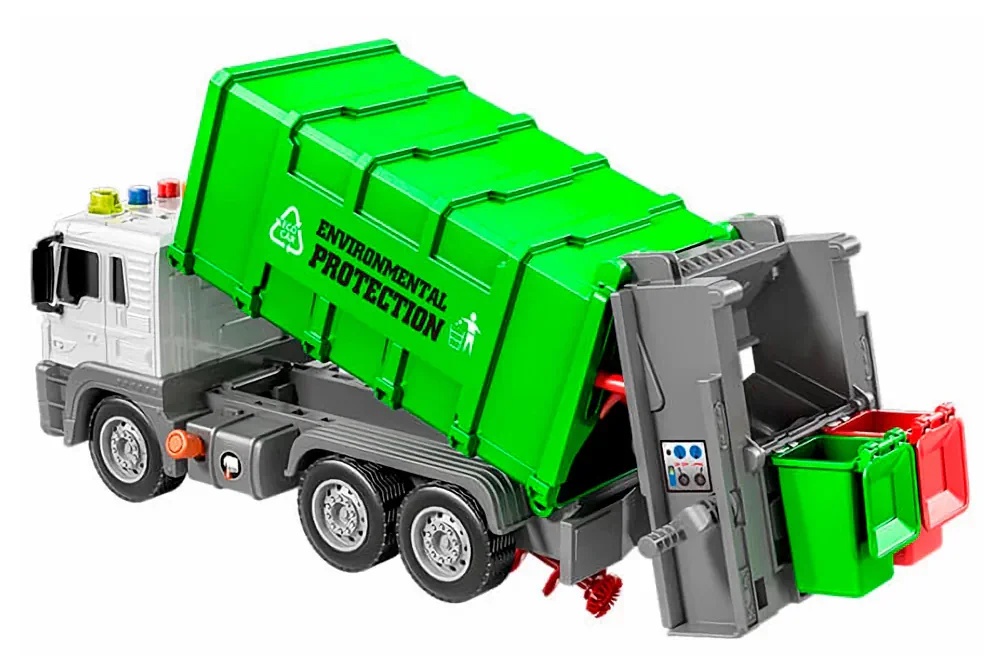 Мусоровоз был идеально воспроизведен, а зеленый цвет привлекает внимание. В набор также входят пластиковые контейнеры, в которые можно бросать мелкие предметы.