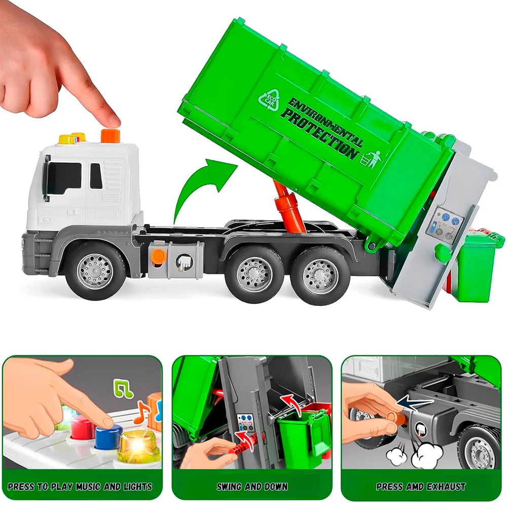 Транспортное средство имеет фрикционный привод задней оси push-pull, просто нажмите на заднюю часть, отпустите и наслаждайтесь скоростью. Открывающийся прицеп позволит вам вывалить мусор в подходящем месте. Чтобы загрузить их в грузовик в первую очередь, просто зацепите контейнер за лестницу, потяните за перекладину, затем контейнер поднимется и высыпет содержимое в контейнер. Чтобы вылить содержимое с помощью насоса, можно поднять весь контейнер.