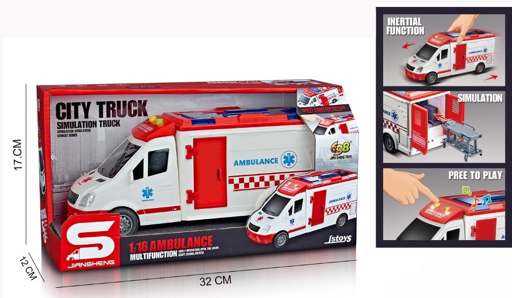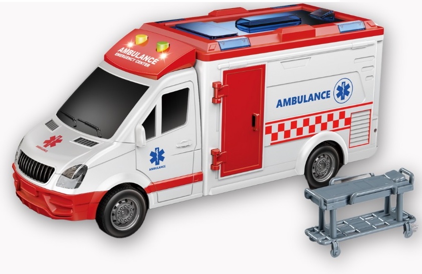 Боковую дверь можно открыть. Для еще большего удовольствия машина скорой помощи оснащена светодиодными фонарями, сиренами и звуковыми эффектами. Нажмите кнопку, расположенную на верхней части грузовика, чтобы активировать световые и звуковые сигналы.