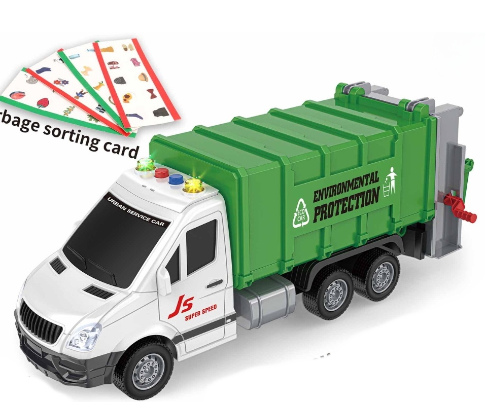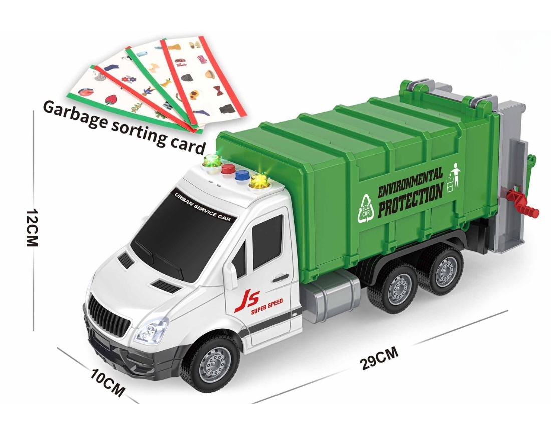 Грузовик со звуками и светом имеет следующие характеристики: он издает звуки и сигнальные лампы, как настоящий автомобиль городской службы. Специальные звуки можно активировать с помощью 4 кнопок, расположенных над кабиной.