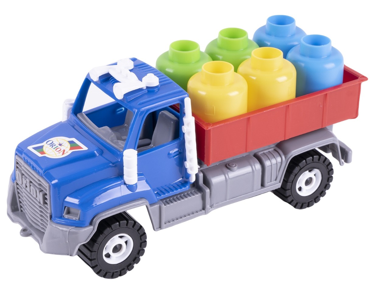 Данная модель игрушки изготавливается на основе предыдущей модели самосвал Камакс арт. 115, но вместо кузова самосвала на шасси устанавливается цельный бортовой прямоугольный кузов, который укомплектован грузом в виде пластмассовых бочек 6 шт. 3-х цветов.