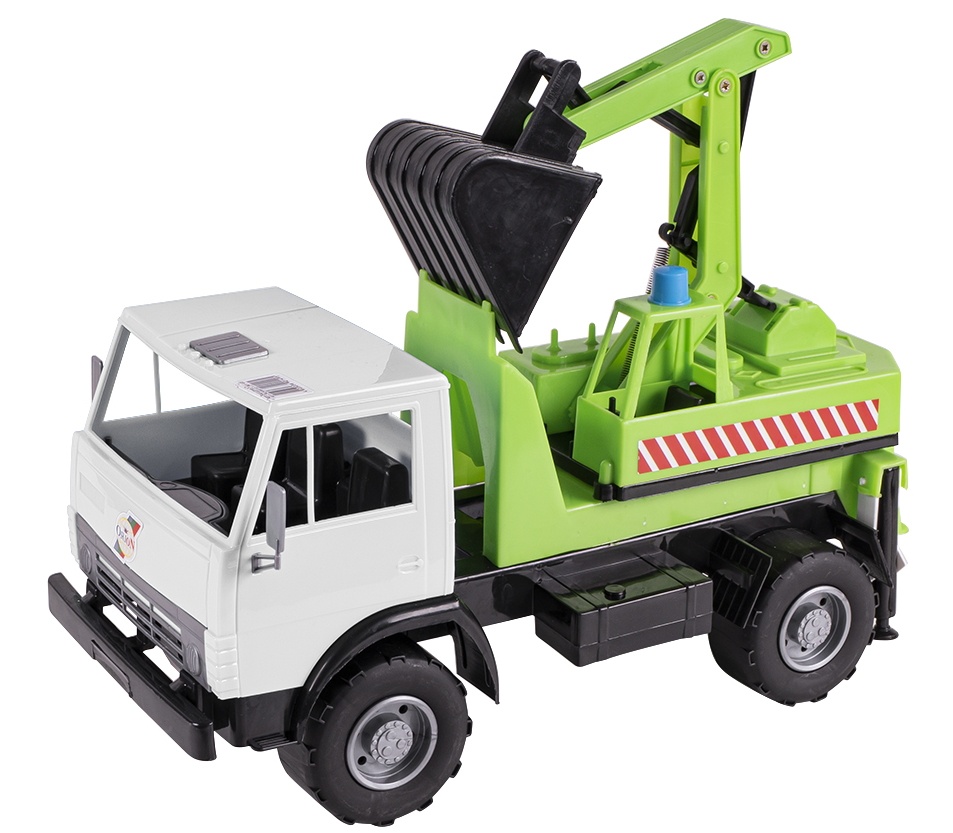 Игрушка транспортная, строительная техника – экскаватор на двухосном автомобильном шасси, длина – 405 мм, ширина 195 мм, высота – 265 мм, масса – 0,640 кг, потребительская упаковка – сетка полимерная.
