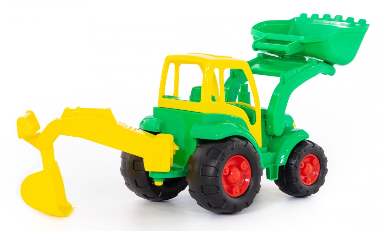 Игрушечный трактор "Чемпион" с лопатой и ковшом может грести лопатой песок, а может ковшом копать ямку в песочнице.