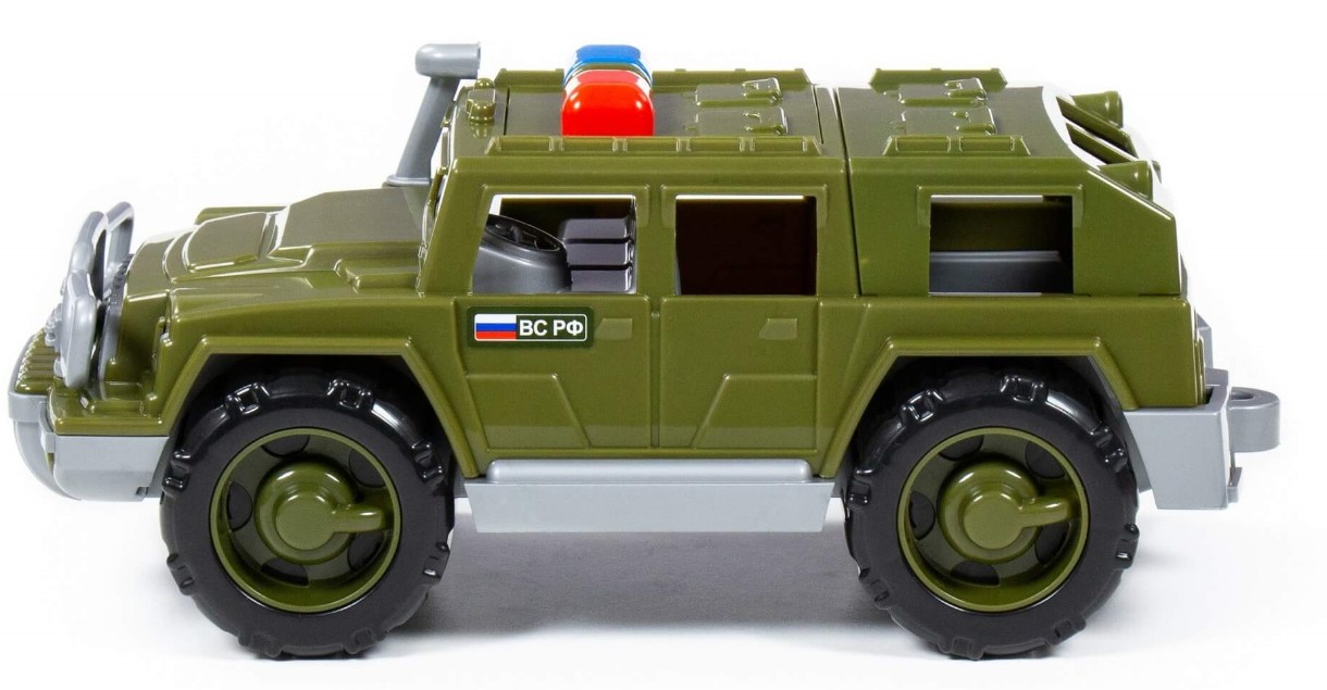 Серия автомобилей «Защитник» от фабрики «Полесье» выполнена в соответствии с реальными аналогами военной техники. Автомобиль-джип военный патрульный "Защитник" изготовлен в защитном цвете, имеет вместительный багажник с тентом (тент съёмный), на крыше автомобиля установлены красно-синие проблесковые маячки. В этой комплектации предусмотрен шноркель - выведенный на уровень крыши автомобиля воздухозабор двигателя. Играть разными машинками и иметь разнообразный автопарк особенно важно для мальчиков. Таким образом, ребёнок знакомится с видами транспортных средств, находит отличия и изучает их устройство. Благодаря прочности материала, из которого изготовлен автомобиль-джип военный патрульный "Защитник", игрушка долго будет радовать ребёнка!
