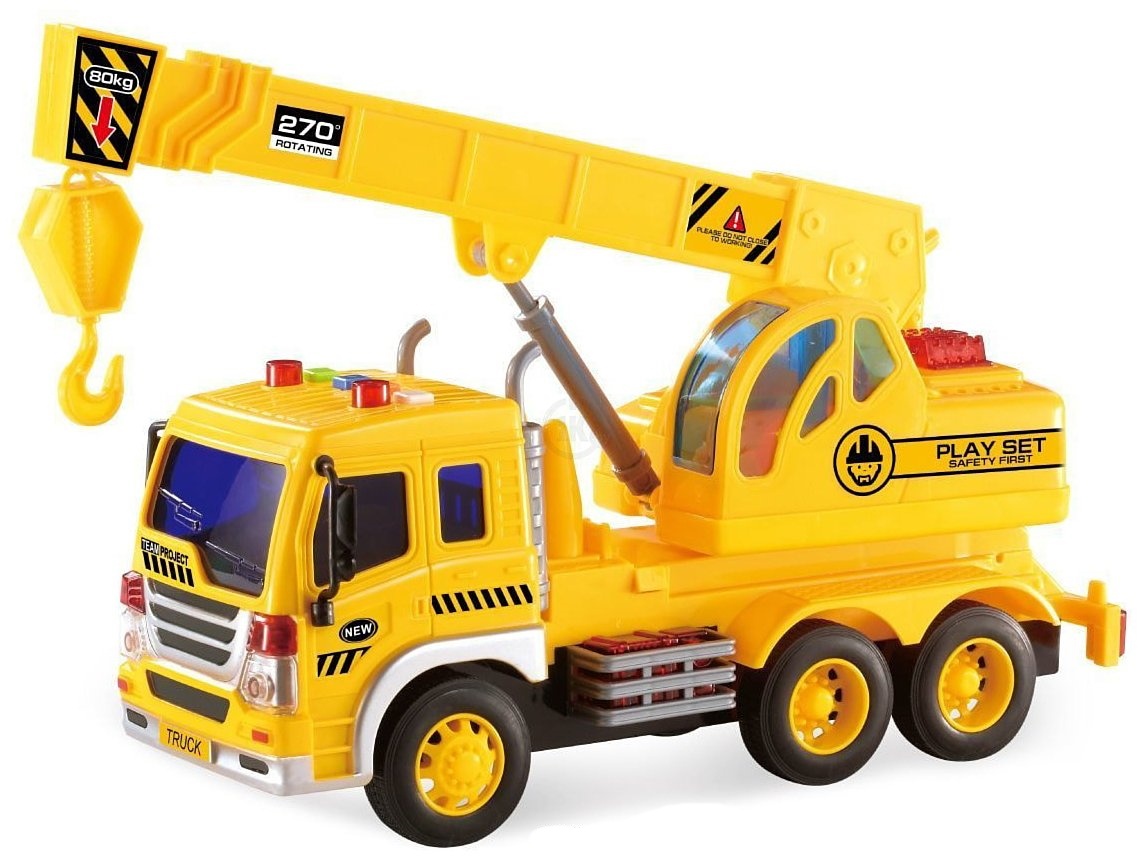 Машинка музыкальная "Builder: Автокран". Инерционная машинка в виде строительного автокрана оснащена 4-я кнопками, каждая из которых отвечает за включения звуковых эффектов: звуковой сигнал (клаксон) автомобиля, звуки включения двигателя, звуки заднего хода автомобиля, звуки работы крана. Башня крана двигается влево и вправо, стрела и крюк поднимается вверх и опускается вниз, выдвигается.