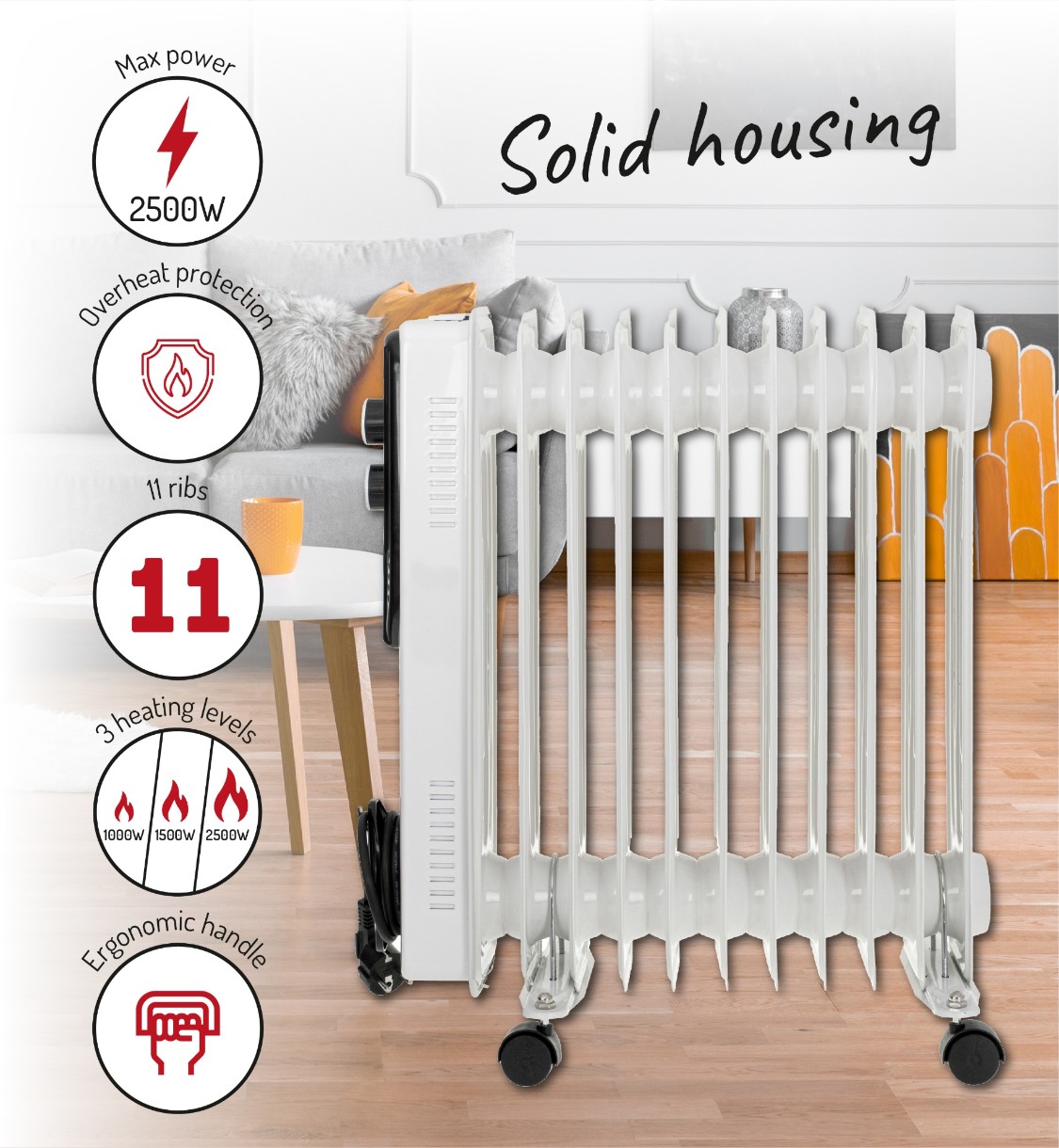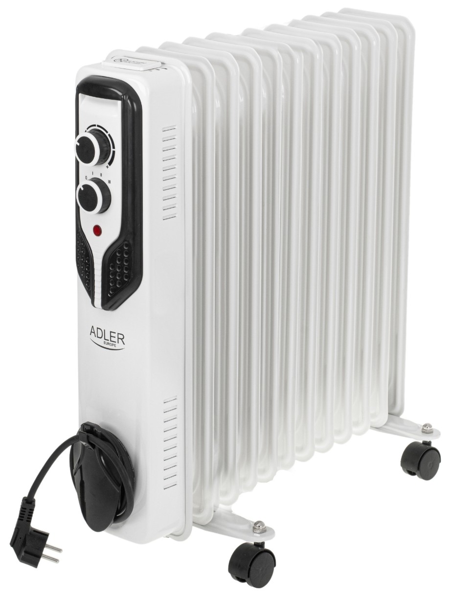 Эффективный масляный радиатор Adler 7817. Позволяет обогреть помещение, где радиаторы отсутствуют или недостаточно эффективны. Незаменим при выходе из строя отопительной системы. Нагреватель позволяет плавно регулировать температуру, работает на 3-х уровнях мощности. Он имеет 11 нагревательных секций и мощность 2500 Вт.