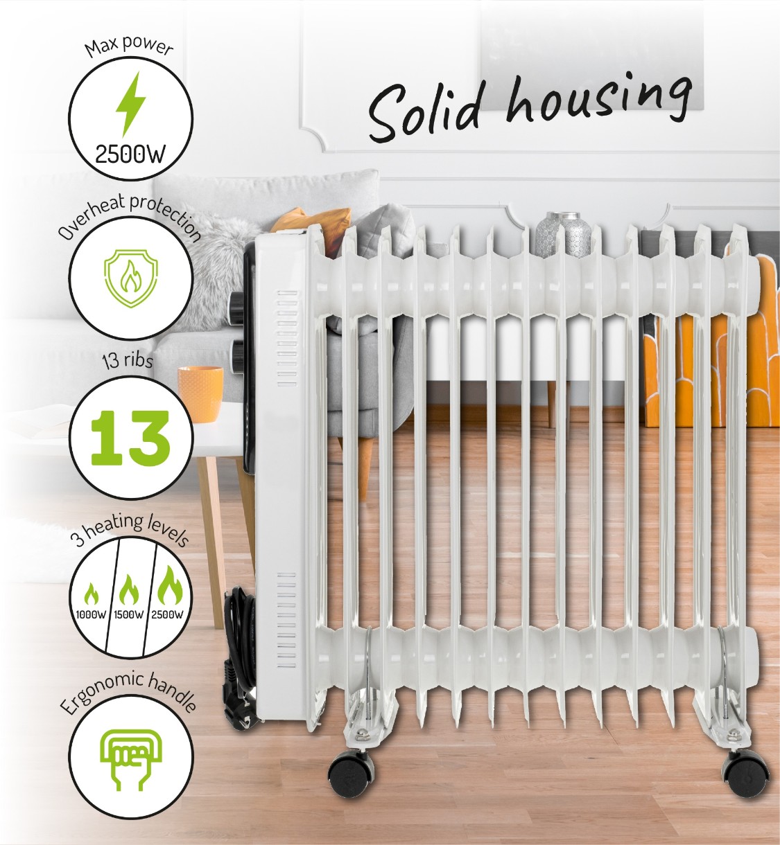 Эффективный масляный радиатор Адлер 7819. Позволяет обогреть помещение, где радиаторы отсутствуют или недостаточно эффективны. Незаменим при выходе из строя системы отопления. Плавная регулировка, работает на 3 уровнях мощности. Нагреватель автоматически регулирует потребляемую мощность в соответствии с заданной температурой нагрева. Для безопасного использования устройство оснащено защитой от перегрева. Он имеет 13 нагревательных секций и мощность 2500 Вт.