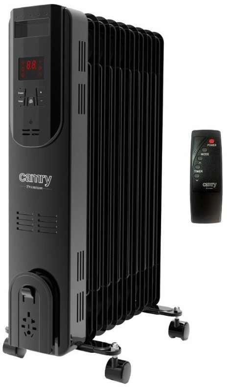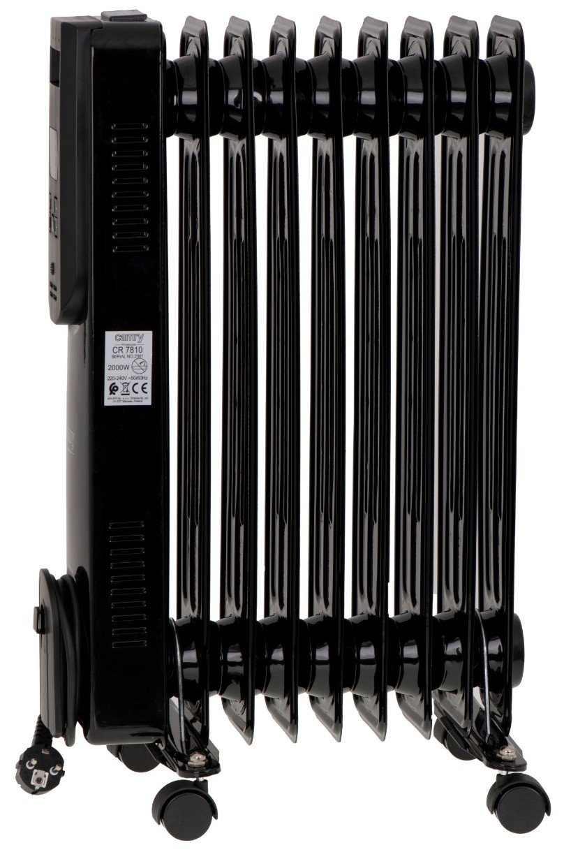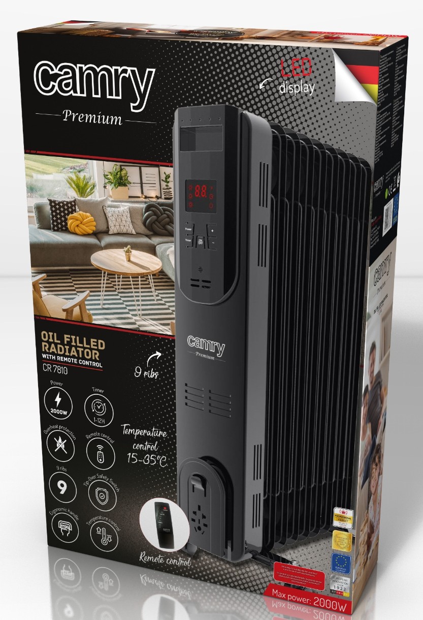Мощный масляный обогреватель с дистанционным управлением и светодиодным дисплеем. Он позволяет обогреть помещение, где радиаторы отсутствуют или недостаточно эффективны. Обогреватель дает возможность регулировать температуру в диапазоне 15°С — 35°С, имеет 3 уровня мощности. Для безопасности использования устройство оснащено защитой от перегрева. Обогреватель имеет элегантный дизайн, поэтому его можно разместить в гостиной или в офисе. Устройство имеет пульт дистанционного управления. Модель CR 7810 имеет 9 нагревательных секций и мощность 2000 Вт.