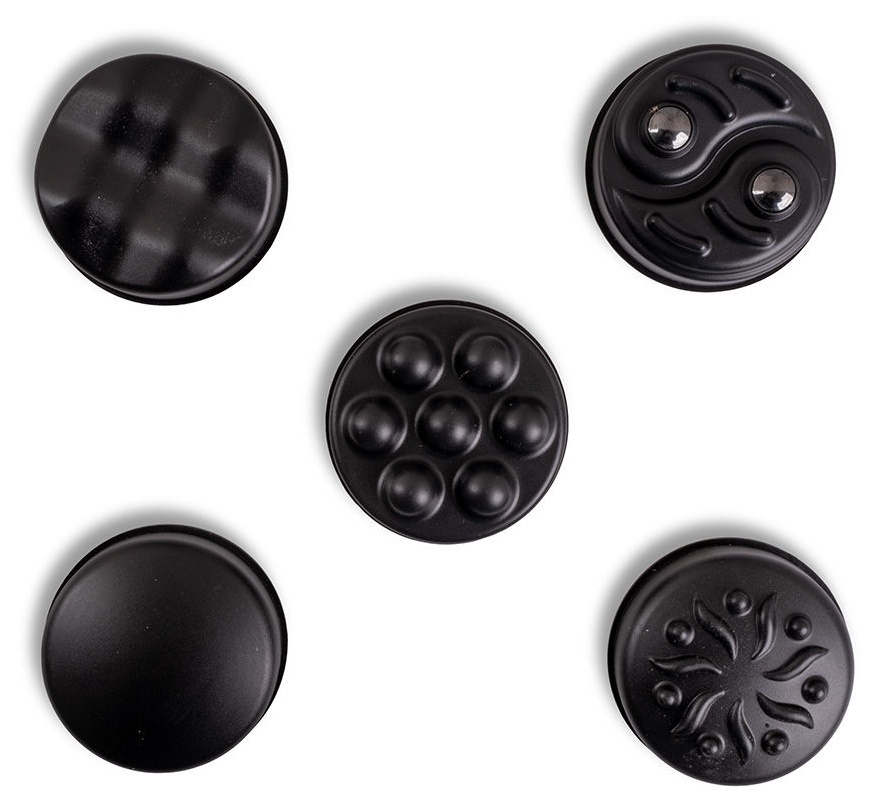 Особенностинасадки: гофрированная головка для массажа мягких тканей, массажная насадка, способствующая улучшению пищеварения, гладкая массажная насадка для универсального использования, массажная насадка, имитирующая массаж пальцами, шариковая массажная насадка