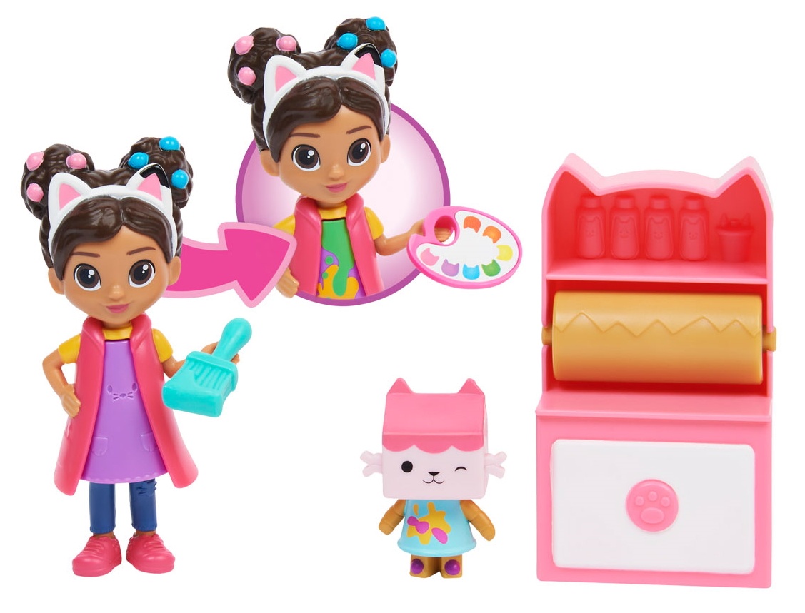 Пришло время заняться настоящим искусством вместе с Габби с очаровательным набором Gabby's Dollhouse Art Studio. Набор, идеально подходящий для любого юного поклонника кукольного домика Gabby's, включает в себя коллекционную фигурку Gabby Girl (9,7 см), фигурку Baby Box Cat, 1 предмет искусства, цветовую палитру и многое другое. Нажмите на кошачьи уши Габби и наблюдайте, как ее наряд переворачивается и превращается из прозрачного в разбрызганную краску. Еще раз нажмите на кошачьи уши, и платье станет чистым. Это так весело! Эта детская игрушка станет отличным подарком для детей от 3 лет и старше.