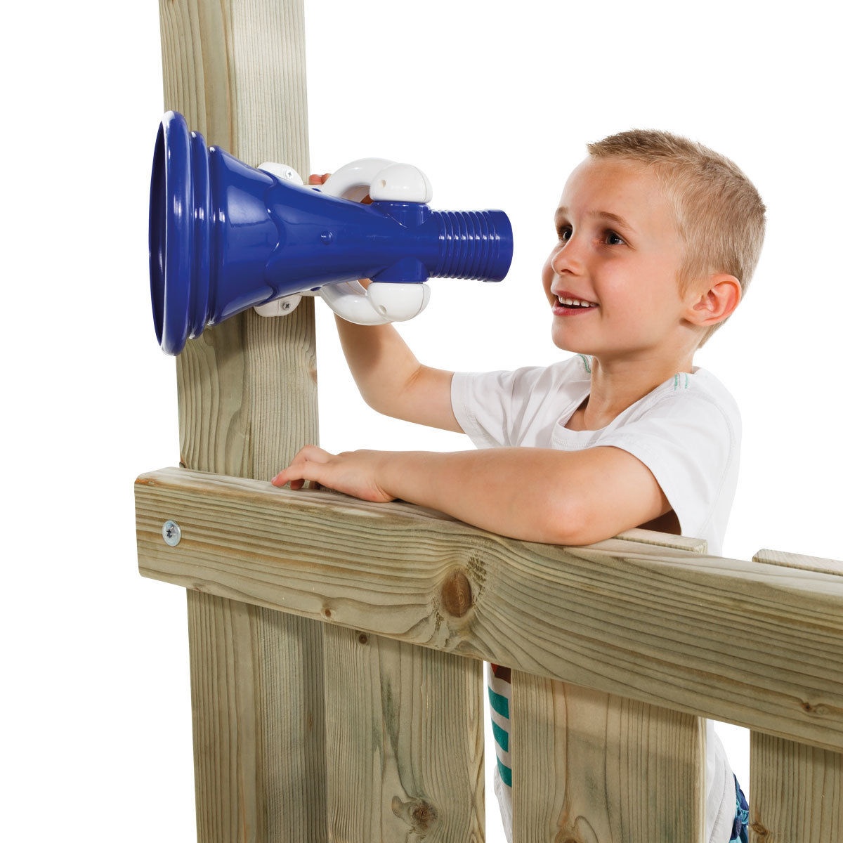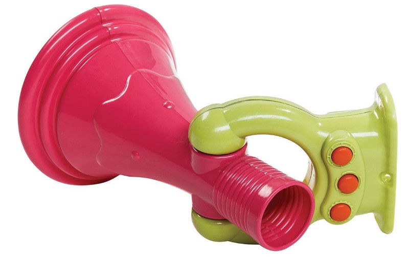 Издает три различных звука (поезд, сирена, слон) при нажатии на оранжевые клавиши. Благодаря конической форме акустически усиливает голос. Крепления в наборе. Питается от двух пальчиковых батареек АА (нет в комплекте).