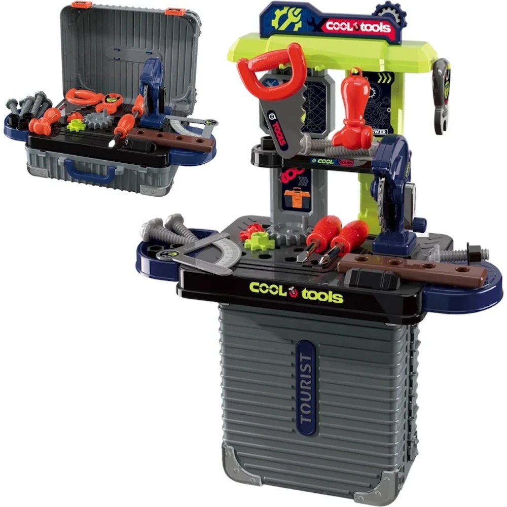 Детский набор инструментов — это не просто игрушка, а настоящий конструктор для юных мастеров. Компактный кейс легко трансформируется в рабочий станок, разложите его и получится удобный столик с полками для деталей.