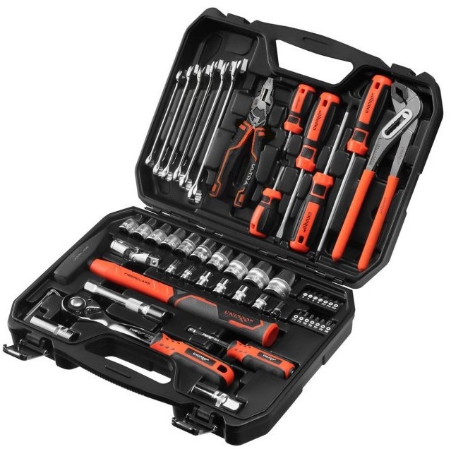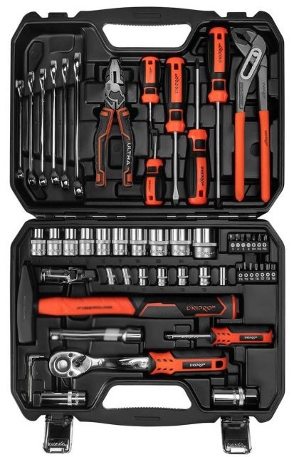 Комплектация набора включает в себя 56 единиц инструментов, обеспечивающих выполнение подавляющего большинства работ. Благодаря подборке инструментов, Вы быстро выполните любые ремонтные работы в своем доме, на даче или в гараже.