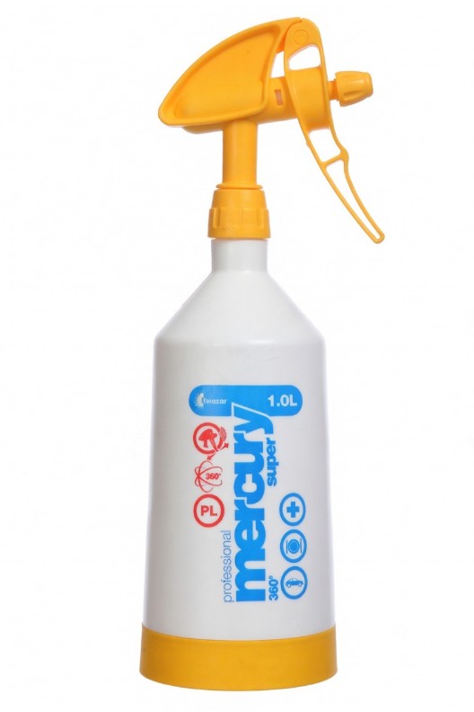 Опрыскиватель Kwazar Mercury Super 360 Pro+ — компактный, но профессиональный тригерный пульверизатор, идеально подходящий для чистки, дезинфекции и обработки разных поверхностей. Он оснащён системой «360°», благодаря которой распыление возможно независимо от положения бака — удобно при работе в труднодоступных местах. Регулируемая форсунка позволяет менять тип распыления — от мелкодисперсной «туманы» до направленной струи. Устройство имеет устойчивый бак и стабилизирующее кольцо, что защищает его от повреждений и обеспечивает долговечность. Его химстойкие уплотнения делают Mercury Super 360 Pro+ пригодным для работы с кислотными, щелочными и другими активными растворами — это делает его универсальным инструментом для клининга, автомоек, хозяйственных и бытовых задач.