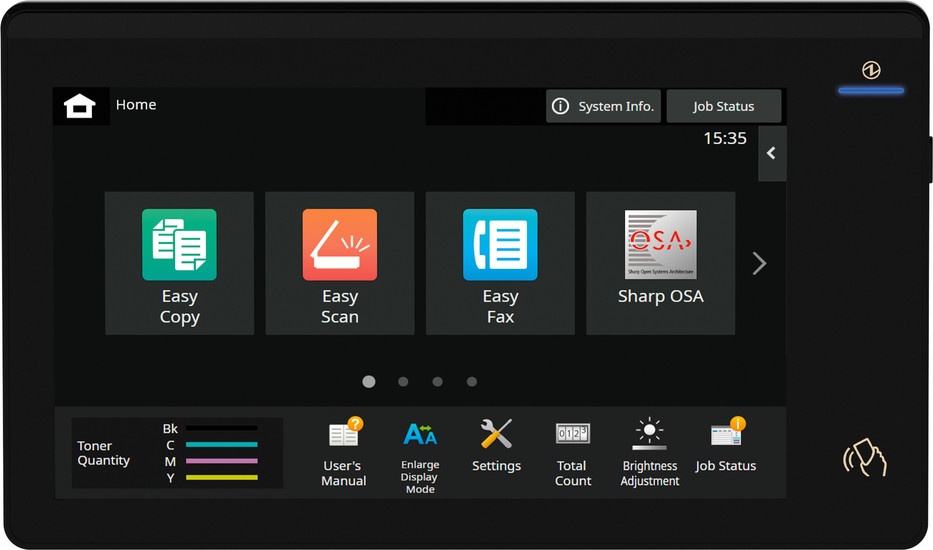 Световые сигналы (LED) обозначат для пользователя текущее состояние МФУ. Интуитивно понятные значки на 10,1-дюймовой наклоняемой цветной сенсорной ЖК-панели управления упростят доступ ко всем необходимым функциям и операциям.