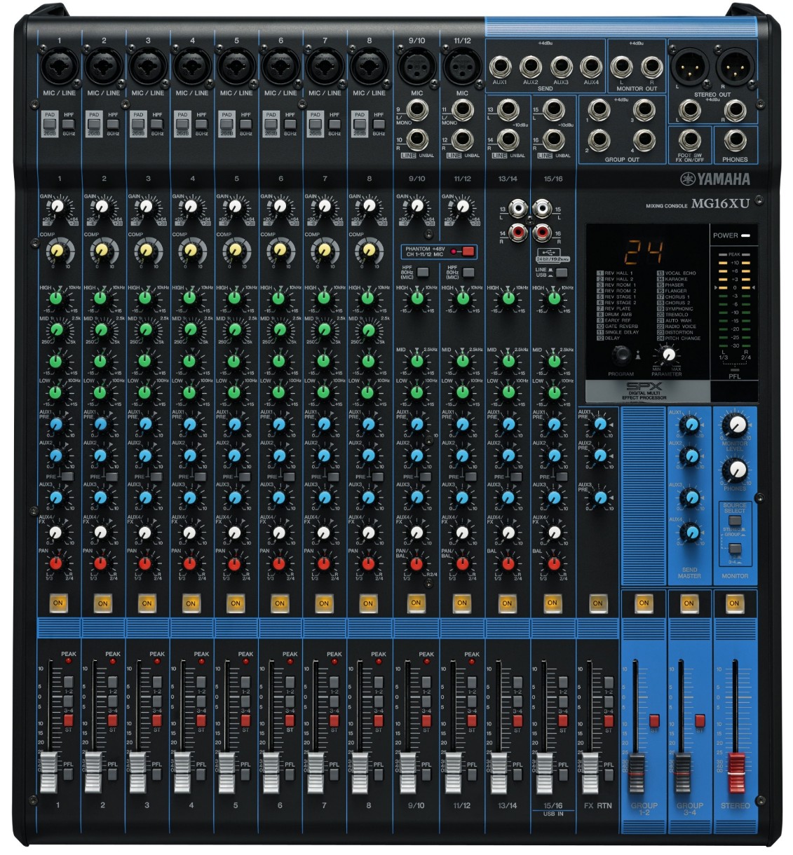 Возможности коммутации MG16XU предусматривают 10 микрофонных/линейных входа с фантомным питанием. Каналы 1–8 оборудованы компрессорами, переключателями чувствительности и обрезными фильтрами HPF. Встроенный процессор эффектов позволяет использовать 24 различных алгоритма обработки звука. Элементы управления включают в себя трехполосный эквалайзер, фильтр High Pass, регуляторы панорама и громкость. В комплект поставки входит приложение для работы со звуком Cubase AI (версия для загрузки).