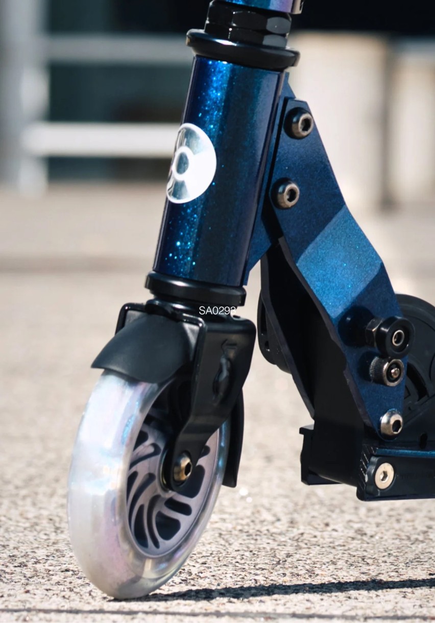 Micro Sprite изготовлен из алюминия, а на платформе напечатан логотип Micro. Руль можно поворачивать на 360 градусов. Скутер оснащен домкратом.